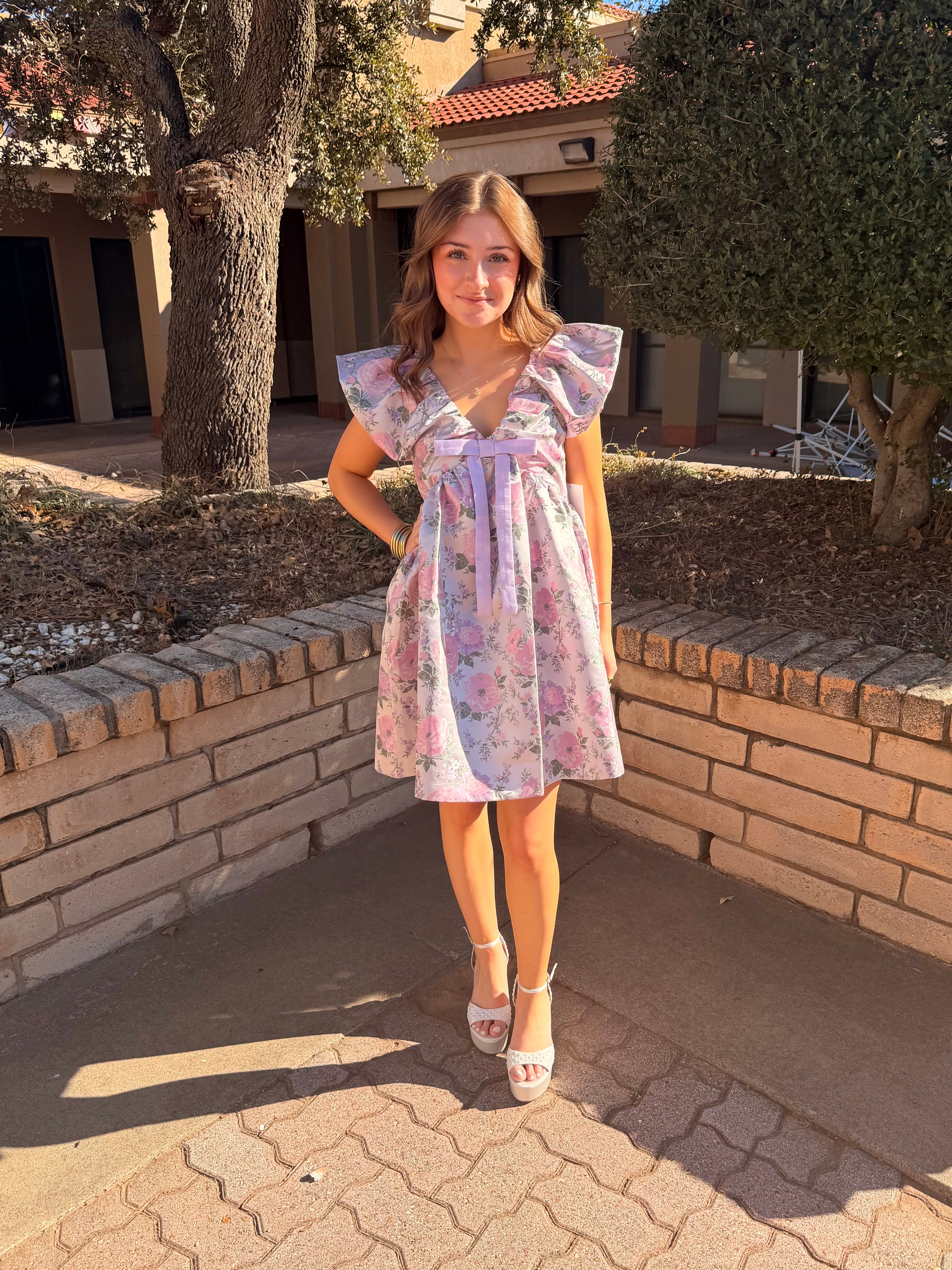 August Apparel Jacquard Bow Sleeveless Mini Dress.