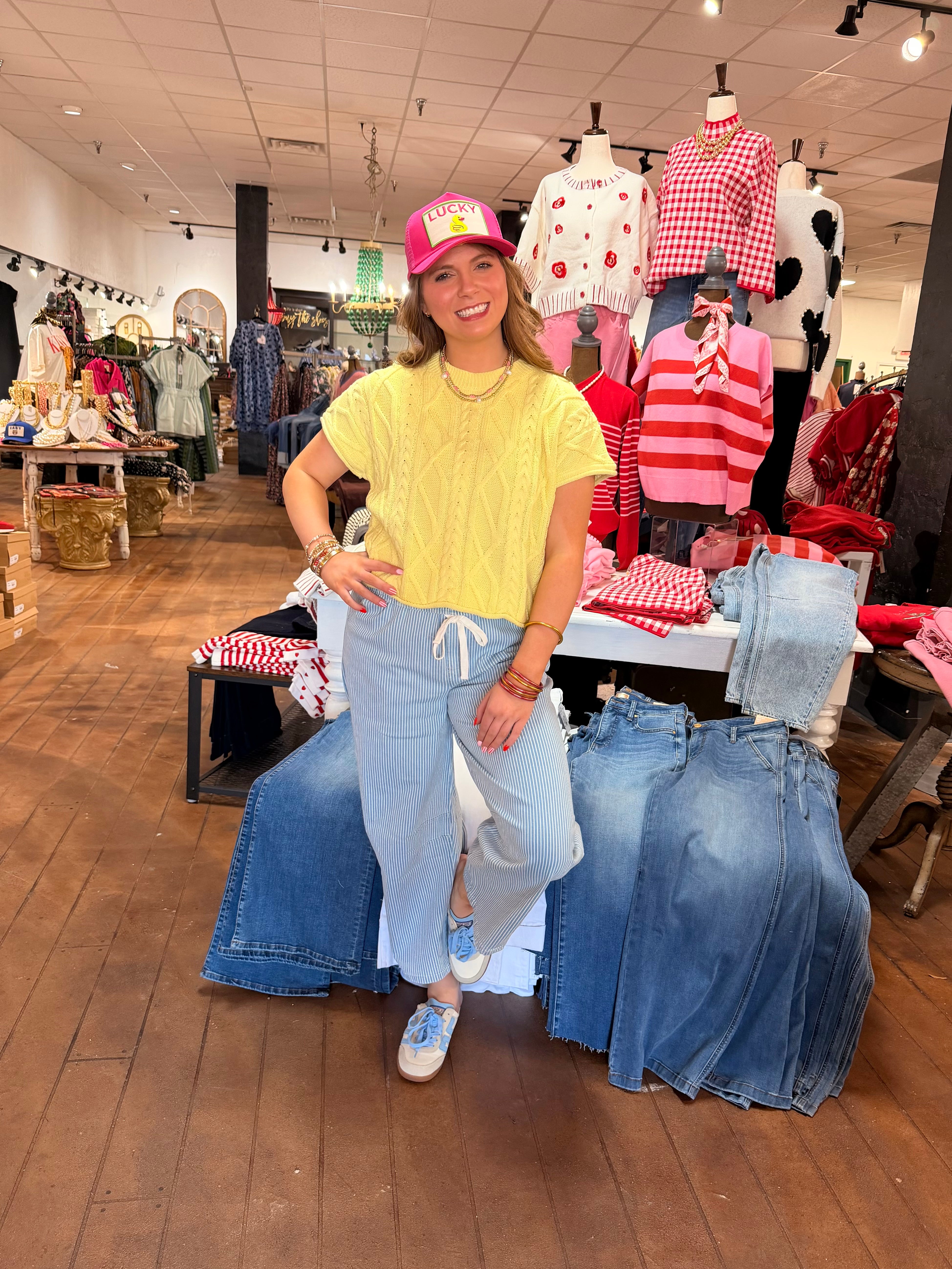 Skies Are Blue, Washed Denim Striped Barrel Pant.