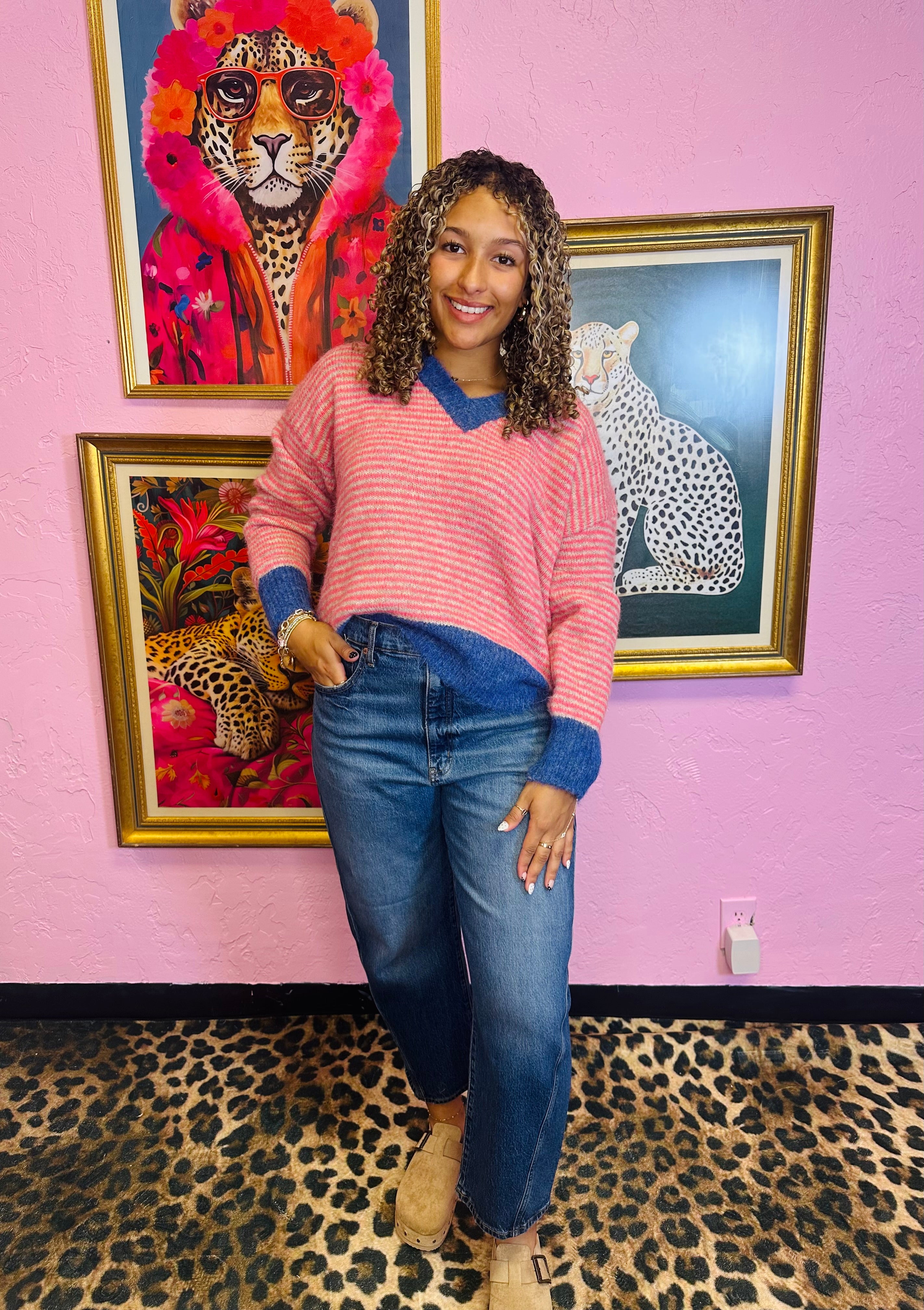 The Cutest Prink And Taupe Stripe With Blue Detailing V-Neck Fuzzy Sweater.